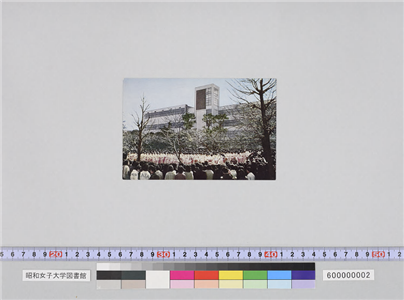 ピンク色の着物を着た学生たちと旧1号館建物。おそらく卒業式の写真(絵はがき)