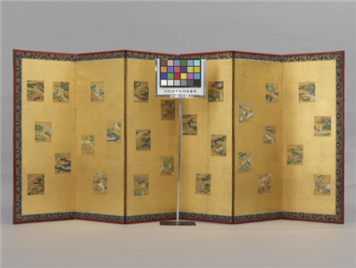 6曲1双,江戸中期写,金銀泥彩色画54枚,本紙各15×13・3糎,金地中屏風貼交,右:121✕289cm(内側:109✕282cm)1曲(121✕47cm)両端のみ(121✕49cm)幅1.5cm、閉幅11cm,左:122✕289cm(内側:109✕282cm)1曲(121✕47cm)両端のみ(121✕49cm)幅1.5cm、閉幅11cm 右隻一曲:6~10頁/右隻二曲:11~16頁/右隻三曲:17~21頁/右隻四曲:22~27頁/右隻五曲:28~32頁/右隻六曲:33~38頁